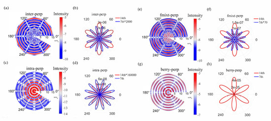 Orientation-dependent perpendicular polarized HHG spectra. (a,b) are for inter-band components, (c,d) are for intra-band components, (e,f) are for mixture term components, (g,h) Berry curvature components.