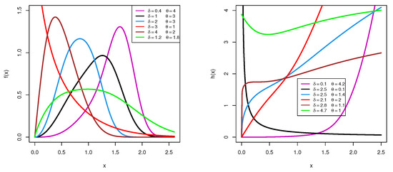 Utilizing various parameter choices for and based on their domains, several shapes for density and hazard functions for the XGW distribution are shown in Figure 1. This shows that the XGW density can be concave-down or left- or right-skewed, while the XGW hazard shapes can be bathtub-shaped or decreasing or increasing.