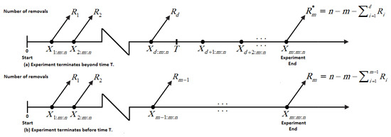 Censored data are commonly used in studies on reliability and life testing. Due to factors like preserving working experimental units for future use, reducing overall time for the test and financial limits, investigators have to gather data using censored samples. Time-censoring (type-I) and failure-censoring (type-II) strategies are the two widely used censoring strategies in life-testing and reliability studies (see, for additional details, the work by Bain and Engelhardt [4]). These methods are not flexible enough to allow units to be removed from the experiment at any point other than the terminal point. To overcome this shortcoming, a more adaptable censoring scheme known as progressive type-II censoring has been developed. Kundu and Joarder [5] proposed a progressive type-I hybrid censoring (P-I-HC) scheme in which n identical products undergo testing via a specific progressive censoring scheme and the examination terminates at an arbitrary time , where T is a time that is predetermined. The drawback of the P-I-HC plan is that the effective sample size is random and it may be a very small number or equal to zero. As a consequence of this, statistical inference techniques will be ineffective. To address this limitation, Ng et al. [6] presented an adaptive progressive type-II hybrid censoring (AP-II-HC) strategy to improve statistical examination efficiency. In this framework, the number of failures m is specified in advance, and the duration of the test is allowed to exceed the predetermined time T. Furthermore, we have the progressive censoring scheme , but the values of some of the may change as a result of the test. This scheme can be summarized as follows: Suppose that n units are subjected to a life test and is the desired total number of failures. At the time of the ith failure , units are eliminated from the test at random. If the mth failure occurs before time T (i.e., ), the experiment terminates and we have the regular progressive type-II censoring. If, on the other hand, , where and correspond to the dth failure time and occur before time T, then we will not remove any living item from the experiment by placing and . This setting assures that we finish the test when we attain the desired number of failures m and that the overall test duration does not deviate too much from the optimal time T. Figure 2 presents a diagrammatic representation of the AP-II-HC strategy.