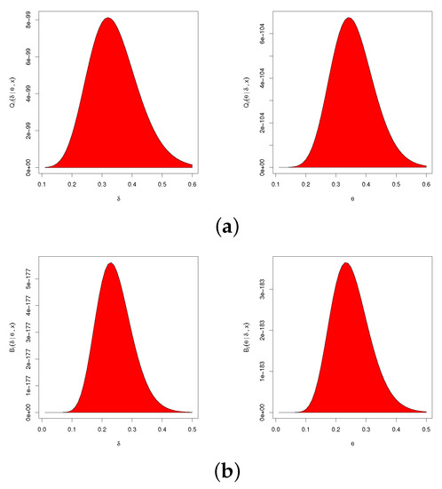 Under the SE loss function, the Bayes estimator of any function of the unknown parameters—say, —using both posterior distributions can be derived, respectively, as follows