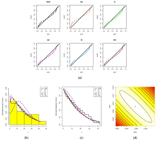 To compare the XGW distribution with the other competitive models presented in Table 2, based on the complete CHN dataset, the evaluated values for the , , , , , and (p-value) statistics are reported in Table 8. The ML estimates (along with their St.Es) of all competing models were also computed (see Table 8). It is obvious from the complete CHN data that the XGW distribution had the highest p-value and the smallest values with respect to the other fitted criteria. Thus, the XGW distribution was the best choice compared to the others. Also, it is clear from Table 3 and Table 8 that the best competitive lifetime model close to the proposed XGW distribution was the two-parameter W lifetime model. Again, based on the CHN data, the PP plots, estimated PDF and estimated/empirical RF, as well as the contour plot of the log-likelihood function, were plotted and are displayed in Figure 10. As we anticipated, the data in Figure 10 supported the results presented in Table 8. Moreover, the data in Figure 10d showed that the ML estimates and existed and were unique.