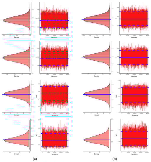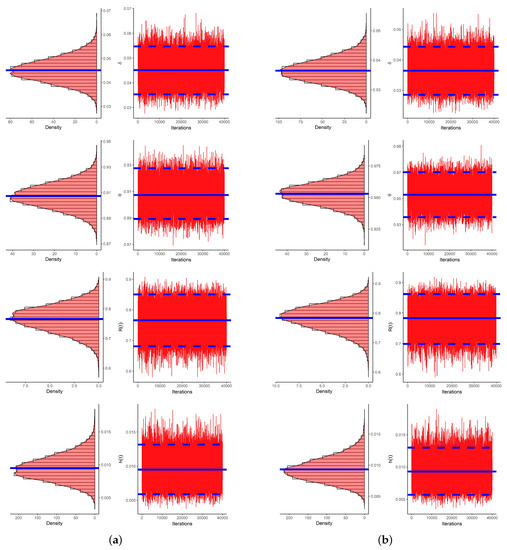 To evaluate the convergence of the 40,000 MCMC variates simulated with the LF and SF approaches, using data as an example, the traces and Gaussian kernel densities are shown in Figure 9 with histogram plots of , , and . In each plot, the sample mean is highlighted by a solid blue line. In each histogram, 95% BCI bounds are highlighted by dashed lines. Figure 9 indicates that the proposed MCMC samplers converged adequately. It also indicates that the generated posterior estimates of and were very close to being symmetric, while those of and were negatively and positively skewed, respectively. Moreover, using datasets, the trace and histogram plots for , , and are presented in the Supplementary File for easy access.