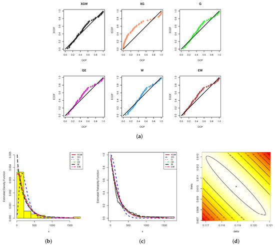 Using the "" package developed by Marinho et al. [36] in 4.2.2 software, the ML estimators with their standard errors (St.Es) for the model parameters, as well as the fitted criteria, were acquired (see Table 3). Since the XGW distribution had the smallest values with respect to the , , , , and statistics, although it also had the highest p-value, Table 3 shows that the XGW distribution provided the best fit compared to all the competitor distributions. Moreover, based on the electronic devices data, we demonstrate the superiority of the proposed model via some useful plots; namely: (i) probability–probability (PP) plots; (ii) estimated PDFs; and (iii) estimated/empirical RFs (see Figure 8). From Figure 8, it can be seen that the graphical presentations support the same numerical findings as listed in Table 3. To examine the existence and uniqueness of the calculated ML estimates of the XGW parameters, the contour of the log-likelihood function for different choices of and based on the complete electronic devices dataset was also plotted and is displayed in Figure 8. It indicated that the ML estimates and existed and were unique. Henceforward, to run any additional calculations based on electronic devices data, we propose considering these values as suitable starting points.
