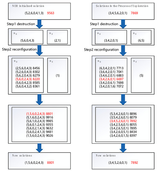 Figure 1 shows the destruction-and-reconstruction process of the Car7 test sample. In the left half of the figure, the initial sequence is {5, 2, 6, 0, 4, 1, 3}, the initial completion time is 9563, and it is assumed that the two randomly destroyed workpieces are {2, 1}. Next, the reconstruction rule is as follows: take out the workpieces from the removed workpiece sequence in turn and traverse all its positions, so that the workpieces are placed in the minimum position with the maximum completion time. After the left half of the sequence was destroyed and reconstructed, a new sequence {1, 5, 6, 0, 2, 4, 3} was generated, and the completion time changed from 9563 to 8801, which indicates that the destructive process was meaningful. On the other hand, in the right half of the sequence, the two pieces randomly destroyed were {6, 5}. After the destruction and reconstruction, the sequence {3, 4, 5, 6, 2, 0, 1}, with a completion time of 7869, was replaced by sequence {3, 4, 5, 2, 6, 0, 1}, with a completion time of 7892. Instead of decreasing, the completion time actually increased. It can be concluded that if a workpiece is destroyed many times, as in the case of {6, 5} in the right half of the figure, and the completion time is not improved, meaningless destruction can be said to have occurred.