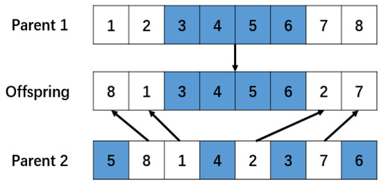 - For the optimization group (group F) of the students, individuals who are different from teachers are retained. When DB = 0, the sequence of workpieces corresponding to the individual and the teacher is the same. In order to avoid meaningless teaching processes, based on the idea of elite deduplication, a PM method is used to generate new individuals, in which inferior solutions are allowed.