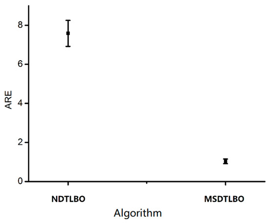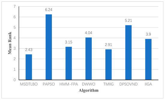 Finally, Friedman’s test was used as a nonparametric approach to test the statistical validity of the experimental results and to rank the algorithms. In the Friedman test, all the comparison algorithms were treated as distinct factors. Table 4 shows the corresponding results, in which the lower the mean rank of the algorithm, the better the performance of the algorithm. Figure 16 shows the results of the Friedman test with MSDTLBO as the control algorithm. In Table 4, it can be clearly seen that the mean rank value of the MSDTLBO algorithm was 2.43, making it the highest-ranking of the seven algorithms. The algorithm thus significantly outperformed the other algorithms in the comparison.