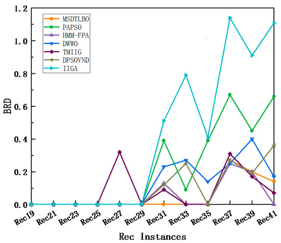 The BRD of MSDTLBO, PAPSO, HMMFPA DWWO, TMIIG, DPSO, and IIGA for Rec instances.