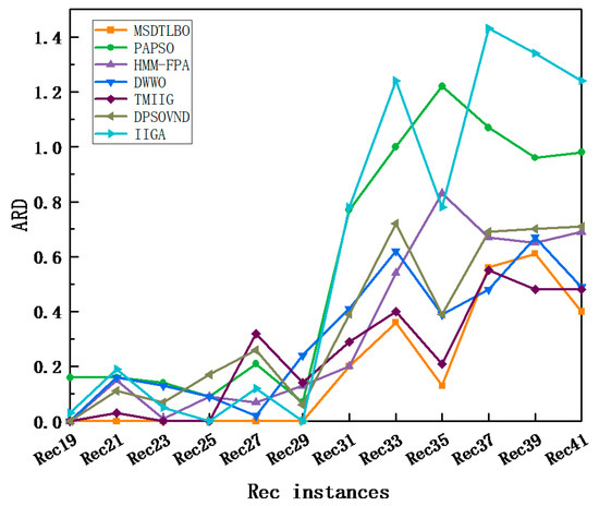 In the experiments, the Rec-benchmark problem and the Ta-benchmark problem were selected for testing. The Rec-benchmark problem set had a total of seven workpiece/machine (N × M) combinations, and each combination had three test examples. The Ta-benchmark-function-problem set had 12 different workpiece/machine (N × M) combinations, each with 10 test examples. The algorithm in this paper (MSDTLBO) was compared with advanced algorithms, such as the population adaptation PSO algorithm [20] (PAPSO), the flower-pollination algorithm based on HMM-FPA [21], the DWWO algorithm [25], the taboo-mechanism-improved iterated greedy algorithm [22] (TMIIG), the discrete PSO algorithm [10] (DPSOVND), and the improved iterated greedy algorithm [30] (IIGA). For the Rec instance, the experimental results are shown in Table 2, and the best results for each instance are given in bold. The BRD-and-ARD-comparison results are shown in Figure 7 and Figure 8 (since the BRD and ARD results for Rec1–17 were both 0, Figure 7 and Figure 8 only show the results after Rec19).