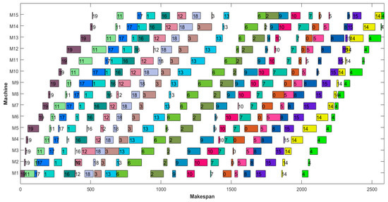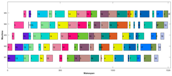 The Gantt charts of Rec01 and Rec17 are shown in Figure 9 and Figure 10. It can be seen that the sequence corresponding to Rec01 was {5, 15, 13, 11, 1, 14, 12, 10, 6, 19, 3, 16, 0, 4, 9, 8, 7, 17, 2, 18}, and that the corresponding completion time was 1526. The corresponding sequence of Rec17 was {19, 11, 17, 1, 16, 12, 18, 3, 13, 6, 2, 9, 10, 7, 0, 5, 8, 15, 14, 4}, and the corresponding completion time was 2587. In addition, the MSDTLBO algorithm can also obtain the optimal solution for the large-scale Rec problem set. Considering the publication-space limitations for this paper, only some examples of scheduling sequences are provided. For example, the sequence of Rec29 was {14, 28, 24, 25, 1, 6, 10, 3, 22, 5, 9, 11, 29, 0, 21, 7, 8, 19, 15, 16, 13, 23, 12, 4, 26, 27, 2, 20, 17, 18}, with a completion time of 3291. The sequence of Rec33 was {46, 30, 2, 36, 24, 42, 31, 27, 40, 41, 4, 35, 6, 10, 25, 20, 7, 12, 47, 19, 48, 15, 14, 44, 13, 18, 23, 39, 26, 17, 43, 1, 21, 33, 38, 37, 8, 28, 45, 32, 49, 9, 0, 5, 29, 11, 34, 3, 16, 22}, with a completion time of 4424.