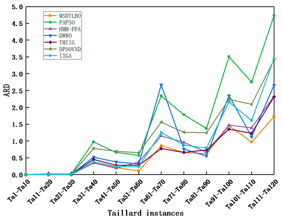 In Table 4, it can be seen that the BRD value of the MSDTLBO was better than those of the PAPSO, HMM-FPA, DWWO, TMIIG, DPSOVND, and IIGA, both for each example and on average. At the same time, the average ARD value obtained using the MSDTLBO was smaller than that of the other advanced algorithms. Figure 11 shows a line graph of the ARD values for 12 different combinations of Taillard instances, from which it can be seen more clearly that in each n × m combination, the MSDTLBO’s ARD values outperformed those of the other algorithms for all the combination instances. The results show that the MSDTLBO exhibits a better performance when solving larger NWFSP instances.