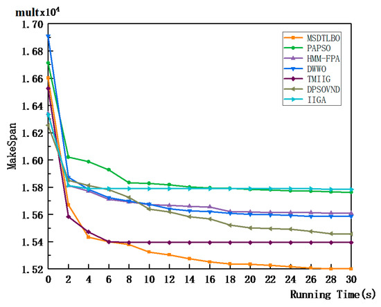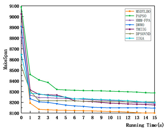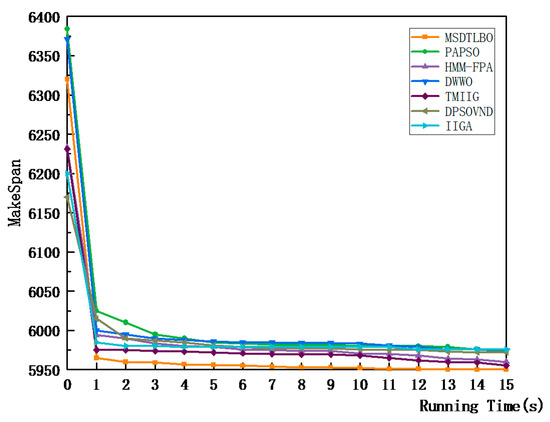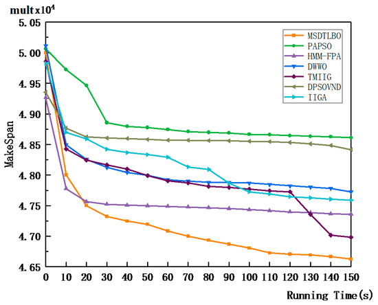 At the same time, to prove that for large instances, the MSDTLBO also outperforms other algorithms under the same running times, the average convergence curves of the seven comparison algorithms on TA60, TA80, TA100, and TA120 are shown in Figure 12, Figure 13, Figure 14 and Figure 15. It can be seen that, for the same running time, the convergence speed of the MSDTLBO was the highest, when dealing with Taillard instances of different sizes, of the seven algorithms in the comparison.