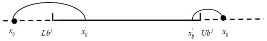 where is the particle position after boundary processing; is a constant number; Levy is a random search path, and its random step size is a Levy distribution. The notation is entry-wise multiplications. Figure 2 visually shows the method for handling particle boundaries. When the particle jumps out of the upper and lower boundaries, it re-enters the search region using Levy steps with random jumps.