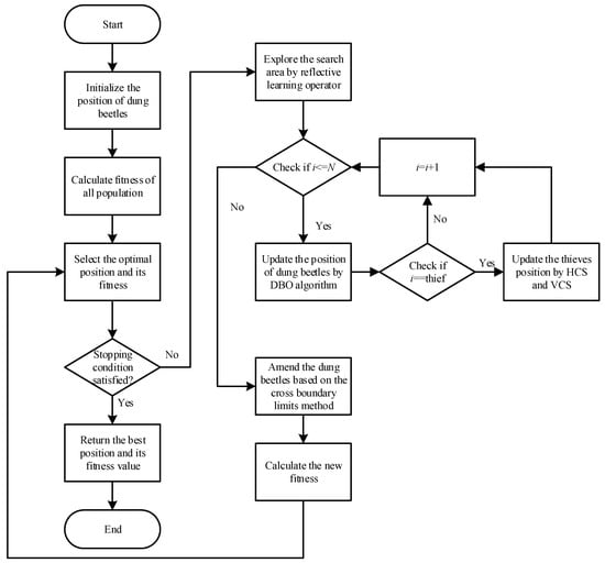| Initialize the positions of the dung beetles While t ≤ T do Calculate the current best position and its fitness Obtain N reflective solutions by Equations (11)–(15) Update the positions of N individuals For i = 1:N do if i == ball-rolling dung beetle then Generate a random number if p < 0.9 then Update search position by Equation (1) Else Update search position by Equation (3) end if if i == brood ball then Update search position by Equation (5) end if if i == small dung beetle then Update search position by Equation (7) end if if i == thief then Update search position by Equation (8) while t ≤ T/4 do Perform HCS using Equations (17)–(18) Perform VCS using Equation (19) end while end if end for Update the best position and its fitness t = t + 1 end while Return the optimal solution Xb and its fitness fb. |