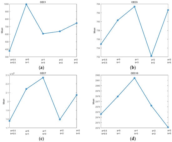 The sensitivity analysis is shown in Figure 4, where the horizontal coordinates indicate the five parameter combinations, and the vertical coordinates indicate the mean values. It can be seen from Figure 4a,c that the algorithm performed optimally when α = 0.5 and β = 0.5. For CEC1, α and β showed a high sensitivity to different inputs. Noting that a = 0.5 and b = 0.5 had the best performance. Moreover, we could see that α = 0.5 and β = 0.5 could obtain the best search performance in CEC7. It is observable in Figure 4b,d that α = 0.5 and β = 0.5 demonstrated the robust behavior of different inputs. For CEC3, from the values displayed in the vertical coordinates, the optimized objective function values obtained for various combinations of a and b were relatively close. Note that α = 0.5 and β = 0.5 obtained second place after α = 2 and β = 2. In CEC10, the performance of α = 2 and β = 5 was better than that of α = 2 and β = 2. However, α = 0.5 and β = 0.5 still achieved second place, showing their robust performance. Therefore, α = 0.5 and β = 0.5 were selected as the recommended parameter values for MDBO.