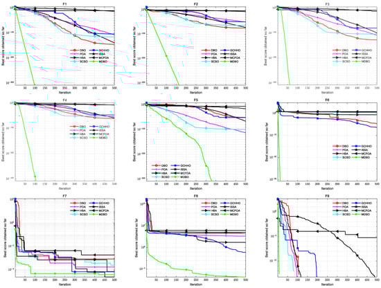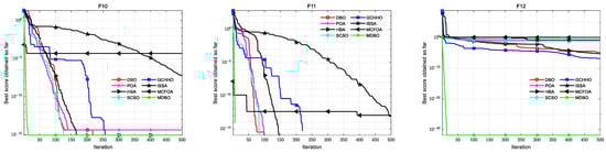 Convergence analysis plays a vital role in evaluating the ability of the local exploitation and global exploration of the algorithm. Figure 5 shows the convergence curves of DBO, POA, HBA, SCSO, ISSA, GCHHO, MCFOA, and MDBO on functions F1–F12. As shown in Figure 5, MDBO’s optimization ability was the best in 11 (F1–F6, F8–F12) out of 12 functions. For functions F1–F6, the MDBO’s curves dropped rapidly in early iterations and kept a fast convergence rate to the optimal solution. Notably, F1–F5 are continuous unimodal test functions, and MDBO can quickly search for the optimal theoretical value of 0. Since the vertical coordinates of the convergence curve were generated by the logarithmic scale, the accuracy of the displayed magnitude was 10−300. For F4, the function curve of MDBO showed an inflection point because crossover operators can help MDBO re-exploit the optimization precision. For function F7, although the progress of convergence to 500 generations was not as good as that of ISSA, the average number of iterations of function curve convergence to the optimal value was the least and converged to the optimal value in about 100 generations. In F9 and F11, MDBO obtained the optimal global value of 0. The curve broke during iterations because the figure showed an average best value in logarithmic. For functions F8, F10, and F12, MDBO exhibited a more competitive performance than the other comparison algorithms. In summary, convergence analysis proved that MDBO had a higher success ratio than the other optimization algorithms.