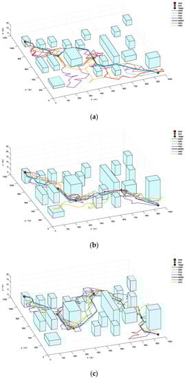Nowadays, researchers have proposed many improved metaheuristic algorithms for solving various engineering application problems including path-planning problems. Yu X. et al. [15] modeled UAV path planning as a constraint satisfaction problem, in which the fitness function included the travel distance and risk of the UAV. Three constraints considered in the problem were UAV height, angle, and limited UAV slope. Jain et al. [20] proposed the multiverse optimizer (MVO) algorithm to deal with the coordination of UAVs in a three-dimensional environment. The results showed that the MVO algorithm performed better in most testing scenarios with the minimum average execution time. Li K. et al. [21] focused on multi-UAV collaborative task assignment problems with changing tasks. They proposed an improved fruit fly optimization algorithm (ORPFOA) to solve the real-time path-planning problem. Pehlivanoglu et al. [12] considered the path-planning problem of autonomous UAVs in target coverage problems and proposed initial population enhancement methods in GA for efficient path planning. These techniques aim to reduce the chances of collisions between UAVs.