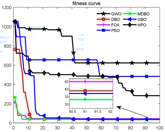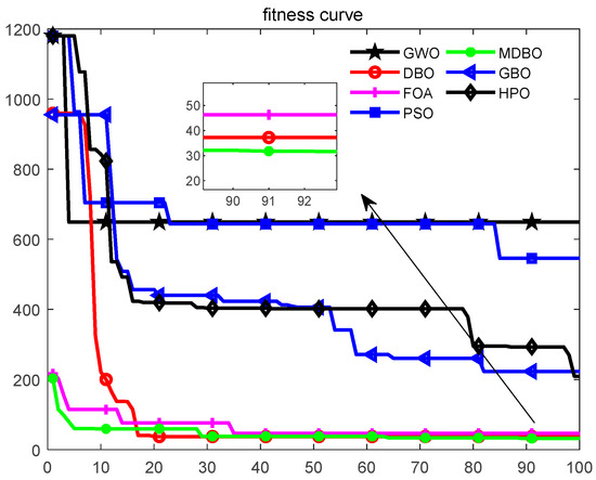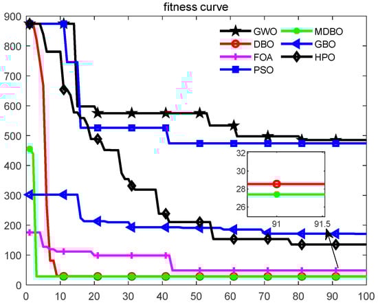 Table 2 shows the mean and standard deviation data of all algorithms on the 12 benchmark test functions tested, and the table also provides the comparison results of the algorithms when the test functions were taken in 30, 50, and 100 dimensions, respectively. As can be seen from Table 2, MDBO achieved the best results in all of the test functions. From the perspective of vertical comparison, MDBO ranked first in the test of other functions, except for some algorithms that showed a comparable performance to MDBO in the F9, F10, and F11 functions. For functions F1–F6, MDBO converged to the theoretical optimal value of 0. For F7 and F8, although MDBO could not have the best value, it showed significant advantages compared with other algorithms. Next, from the results of the dimension comparison, the results of 100 dimensions, 30 dimensions, and 50 dimensions were similar, with little change in the order of optimal value. Based on the above analysis, it can be seen that MDBO has more significant competitive advantages in solving unimodal and multimodal functions. The results reflect the ability to jump out of the local optima by the reflective learning operator and crisscross optimizer.