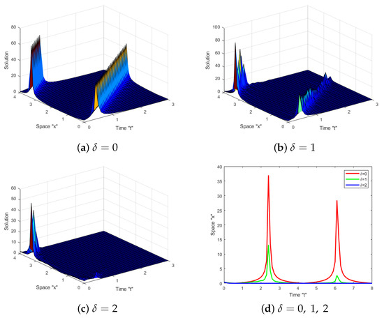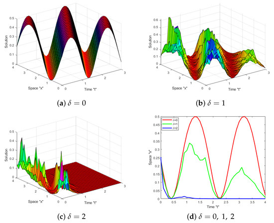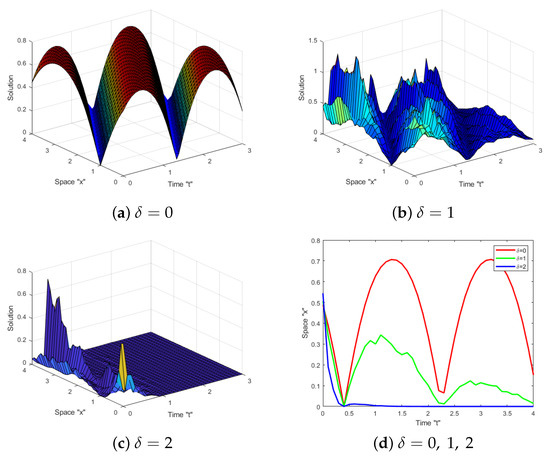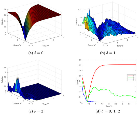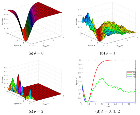 In this section, we address the effect of Brownian motion on the exact solution of the SFS (1). Several diagrams are supplied to show the behaviors of some obtained solutions, such as (23)–(26), (47) and (48). Let us fix the parameters and to simulate these diagrams.