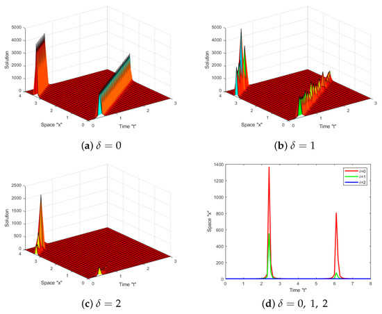 Now, we can see from Figure 1, Figure 2, Figure 3, Figure 4, Figure 5 and Figure 6 that when the Brownian motion is ignored (i.e., when ), there are many other kinds of solutions, including periodic solutions, kink solutions, and so on. After short transit patterns, the surface becomes flatter when noise is incorporated and its amplitude is increased by . This demonstrates that Brownian motion stabilizes the SFS solutions, maintaining them around zero.