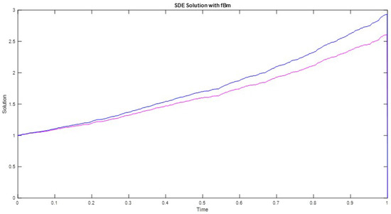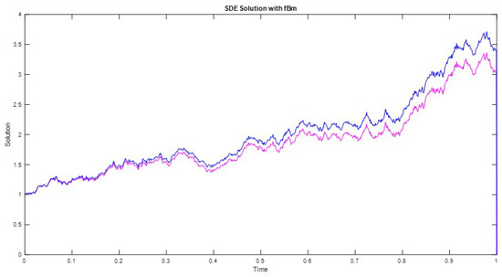 In most cases of crisp (classic) stochastic differential equations, they are solved numerically, provided that the existence of a solution to such an equation is justified. In the case of our fuzzy Equation (18), we have justified the existence of a solution in theoretical considerations in the previous section, and we now do even more by showing what the solution of this equation looks like clearly. This is possible because the equation is of a linear type.