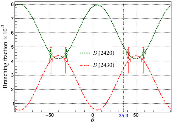 The values of the theta angle that could reproduce the experimental data were 49.0 , 31.3 , 41.0 , and 58.7 , as shown in Figure 1. Notice that the mixing angle θ was defined in the basis of D 1 ( 2420 ) and D 1 ( 2430 ) . By combining Equation (4) with Equation (2), we could also express the weak eigenstates D α ( β ) on the basis of | 1 P 1 and | 3 P 1 as follows: