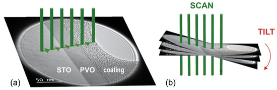 (a) Representation of the scanning procedure on a TEM image of the PVO thin film (dark-gray stripe). On its left and right sides we, respectively, find the STO substrate and the amorphous coating. The electron nanobeam while scanning along the thickness of the thin film is represented in green. After a scan is completed, the sample is tilted (b) and the scan is performed again.