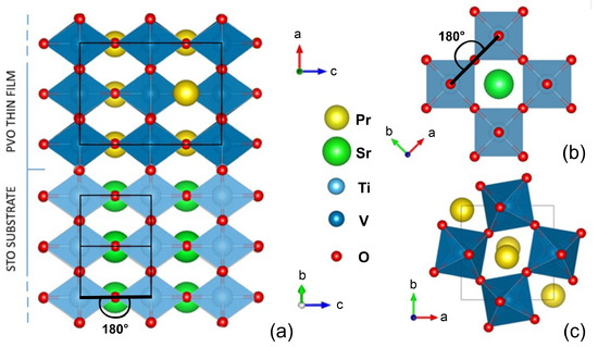 (a) Schematic representation of the expected strained structure of the PVO thin film on the STO substrate in the first deposited layers, viewed along the direction of the interface corresponding to the a axis of PVO. The unit cells of PVO and STO are represented in black. (b,c) Projections along the c axis of the STO and PVO unit cells in bulk, respectively, highlighting the difference in the tilting system of the octahedra between the two.