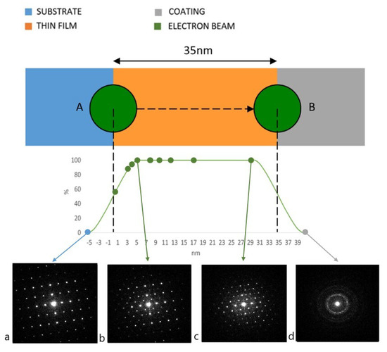 Schematic representation of the SPET experiment. The horizontal dotted arrow indicates the scanning direction, while A and B configurations of the electron beam coincide, respectively, with 0 and 35 in the nm scale. Beneath the scheme, a graph representing the percentage of electron beam area impinging the film for every position is shown, considering a beam diameter of 10 nm. Diffraction patterns extracted from the SPET experiment processed in this work at their respective thicknesses are indicated as green dots. Examples of diffraction patterns are also provided for (a) the substrate, (b) the thin film at 5 nm, (c) the film at 29 nm and (d) the coating.