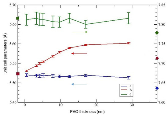 Refined unit cell parameters of PVO for different thicknesses of the thin film. The arrow under each experimental curve indicates the y scale to which the curve refers. The squares on the left y axis represent the reference unit cell parameter of bulk STO transformed in order to fit the orthorhombic cell of PVO (; ). Since and are equivalent and superimposed, only one of the two is visible. The rhombus values on the right y axis represent the reference unit cell parameters of bulk PVO. Squares and rhombuses are of the color of the series they refer to.