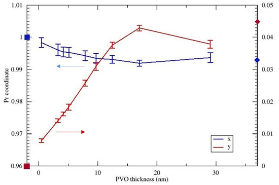 Refined coordinates of Pr atom in PVO unit cell for a selection of ROIs across the film thickness. The arrow under each experimental curve indicates the y scale to which the curve refers, and z values were not plotted since the Sr atom lies on the special position . Squares on the left y axis indicate the Sr coordinates for STO, corresponding in PVO to the atomic site of Pr, while rhombuses on the right y axis indicate the Pr coordinates for bulk PVO, the color corresponding to the one of the series they refer to.