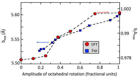 Evolution of the b lattice parameter (in Å) as a function of the octahedral rotation amplitude (in fractional units) from experiments (filled blue squares, left scale) and variations in from DFT simulations (red filled circles, right panel). An amplitude of 1 corresponds to the largest value of octahedral rotation amplitude from theory and experiments, respectively. is set to the largest value of b obtained for a rotation amplitude of 1 in the DFT simulations.