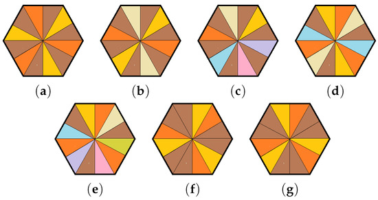 (a–e) Symmetric semiperfect colorings of induced by the subgroup . (f) Symmetric semiperfect coloring of induced by the subgroup . (g) Symmetric semiperfect coloring of induced by the subgroup .