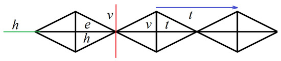 We now look at symmetric perfect and symmetric semiperfect colorings of the group , also denoted , which is the symmetry group of a frieze pattern of type . In Figure 3, we see a portion of an infinite strip that is left invariant by G with some of the triangles labeled using the generators of . Here, h is a mirror reflection with a horizontal axis indicated by the green line, v is a mirror reflection with a vertical axis represented by the red line, and t is the translation given by the blue vector. Note that the aforementioned isometries leave the pattern unchanged. The subgroup generated by squares of the elements of is . Using GAP, we obtain 15 nontrivial subgroups of that contain S. These subgroups are given in Table 3 with the corresponding colorings shown in Figure 4 in the order by which the subgroups appear in the table.