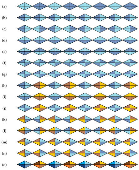 - Grunbaum, B.; Shephard, C. Perfect colorings of transitive tilings and patterns in the plane. Discret. Math. 1977, 20, 235–247. [Google Scholar] [CrossRef]