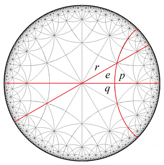 We finish this section by giving examples of colorings of the triangle group . This particular group is defined by . Geometrically, and r can be taken as the mirror reflections along the lines containing the sides of a triangle e whose interior angles are of measure , , and (see Figure 6), with the axes of the reflections p, q, and r opposite to the angles , , and , respectively.