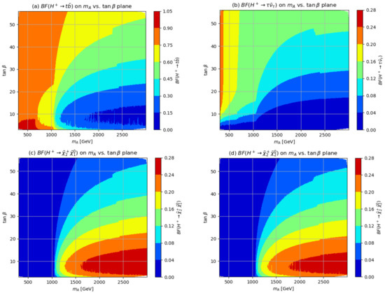 The LHC signal from charged Higgs boson production will clearly depend on how decays. For TeV scale values of , the dominant SM decays are via and . Decays to h, W and Z bosons are dynamically suppressed. Charged Higgs boson decays via the gaugino plus higgsino modes can also be important if these are not kinematically suppressed. With this in mind, in Figure 3, we show the most relevant branching fractions (BFs) in the vs. plane for the model plane (Equation (5)). The various ranges of branching fractions are shown by different colors, with the larger ones denoted by red and orange, turning to shades of green and blue culminating in the smallest branching fractions denoted by dark blue. The branching fractions are extracted from the Isasugra code [35].