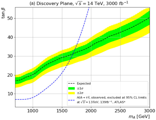 - Franconi, L.; Haug, S.; Weber, M.; Anders, J.K.; Fehr, A.; Beck, H.P.; Ereditato, A.; Lehmann, N.; Miucci, A.; Weston, T.D. Search for heavy Higgs bosons decaying into two tau leptons with the ATLAS detector using pp collisions at = 13 TeV. Phys. Rev. Lett. 2020, 125, 051801. [Google Scholar] [CrossRef]