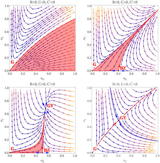 From the previous discussion, one can observe that BZ FP can exist only for . As a consequence, corresponds to the IR-attractive direction, while and is relevant in IR. For the perturbative GY fixed point, also gives rise to the IR-irrelevant direction, while is IR-relevant only for . The different phase diagrams are presented qualitatively in Figure 1, projected onto the (gauge, Yukawa) plane. In the following, we provide short comments to Figure 1 [62]: