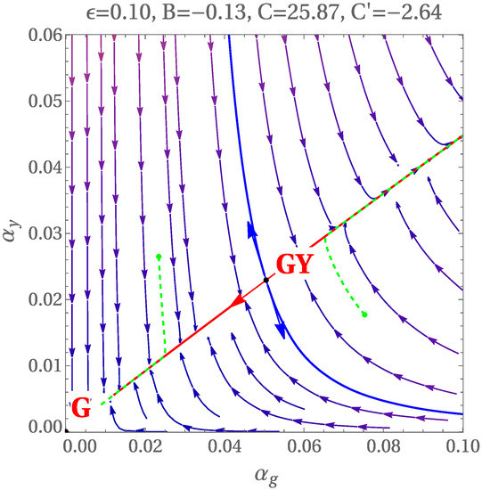 In Figure 2, we demonstrate the flow towards the IR from the fixed point in Equation (31) for a particular value of . Since and , for , the flow features one strongly IR-attractive (driven by ) and one weakly IR-repulsive (corresponding to ) direction.