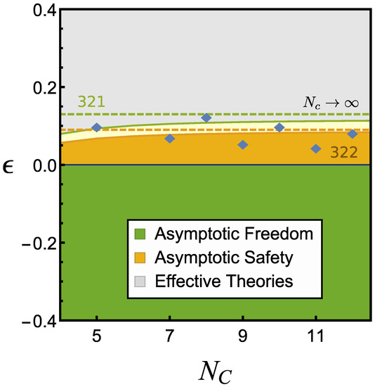 For , the screening due to fermions dominates the antiscreening of the gauge degrees of freedom (resulting in ), while for , the opposite happens (). Expansion in powers of indicate that the gauge–Yukawa fixed point and its critical exponents stay perturbative as long as remains small; see details in Refs. [61,70]. Here, it is suffice to note that in theories containing non-Abelian gauge interactions together with fermionic and scalar matter, large-N methods confirm the viability of ultraviolet gauge–Yukawa fixed points.
