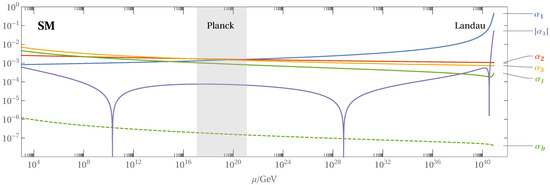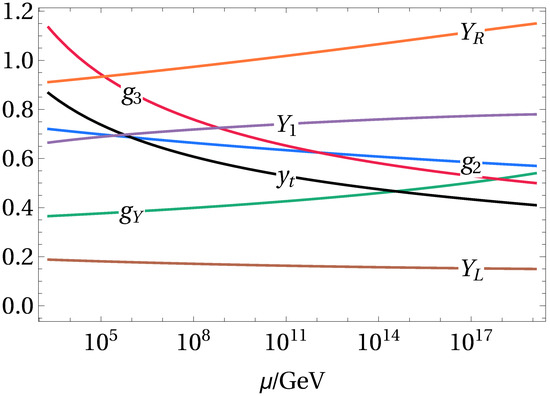 As can be observed, the SM itself has many similarities with the models of Equation (23). It is a gauge theory, with Abelian and non-Abelian gauge groups, and it contains fermionic and scalar fields with Yukawa interactions. Therefore, it is natural to wonder whether the SM has ultraviolet fixed points that make it asymptotically safe. However, it is clear that the SM does not exhibit asymptotic safety in the UV, as its coupling hits a Landau pole [79] and the Higgs quartic encounters stability problems (see, e.g., Refs. [42,80]). Thus, in the SM, the Yukawa couplings are not able to reach a fixed point for all gauge couplings. Nevertheless, it may be possible to make it asymptotically safe if the SM is extended. This can be conducted by including new Yukawa interactions that can provide UV FPs for the SM gauge couplings. For example, the new states coupled to the SM through either gauge or Yukawa interactions will eventually modify RGEs of the SM couplings. Thus, minimal extension of the SM and assumptions that the vector-like fermions are charged under the SM gauge group may improve the situation.