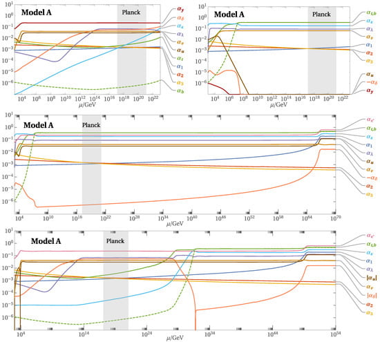The key feature of the Lagrangian (23) is the presence of the Yukawa y coupling, which is required to arrange the interacting UV fixed points. It should be noted that here we neglect all possible mass terms and trilinear scalar interactions. It is also worth pointing out that the single coupling y in Equation (23) does not account for the most general form of Yukawa interactions. Indeed, the flavour structure of the model allows one to write