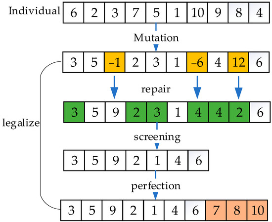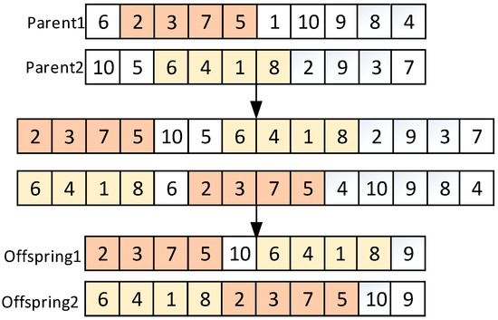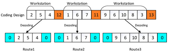 According to the characteristics of GVRPSDPTW, the chromosome coding in this algorithm adopts the natural number coding mechanism. The total number of genes on one chromosome in the population is . The workstation number is , and the AGV number is . We make the chromosome gene composition multiple gene fragments by inserting the AGV number in the workstation number. Each gene fragment represents a path of the AGV fleet in the logistics transportation task.