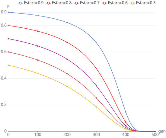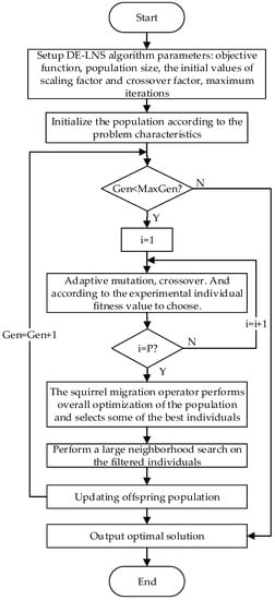 The algorithm uses a differential evolution algorithm as a global search algorithm. Firstly, we design a mutation strategy with an adaptive scaling factor and an adaptive crossover operator. Then we refer to the foraging process of the squirrel search algorithm [38] to optimize and screen the population. Finally, we introduce a large neighborhood search as a search mechanism to perform local searches on excellent chromosomes. The large neighborhood search algorithm has a stronger ability in the local search stage and can overcome the shortcomings of the differential evolution algorithm. Among them, P is the population size, MaxGen is the maximum number of iterations, D is the optimal number of individuals in the population, MaxN is the number of iterations of large neighborhood search, and f is the fitness function.
