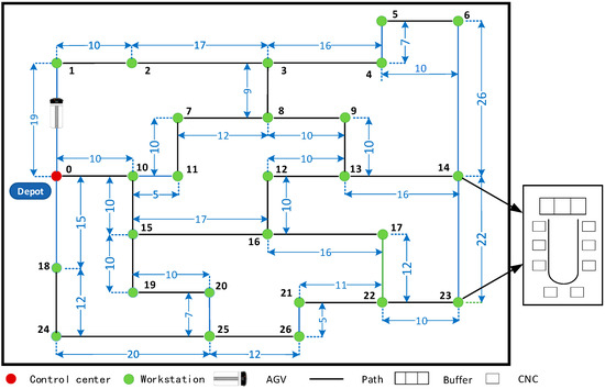 We take the production data in the actual production process of an intelligent workshop as an experimental case and then simulate the process of AGVs performing logistics transportation tasks. The purpose is to verify the benefits of the proposed green vehicle path planning model and to evaluate the practical applicability of DE-LNS. The workshop is mainly composed of automation workstations (material buffer and CNC), material handling equipment (AGV), a production scheduling center, and a cargo storage center (depot). The workshop topology map we established is shown in Figure 8. The map is asymmetric, and it consists of 27 nodes and 32 edges. The number 0 is the production scheduling center, and numbers 1–26 are the workstation.