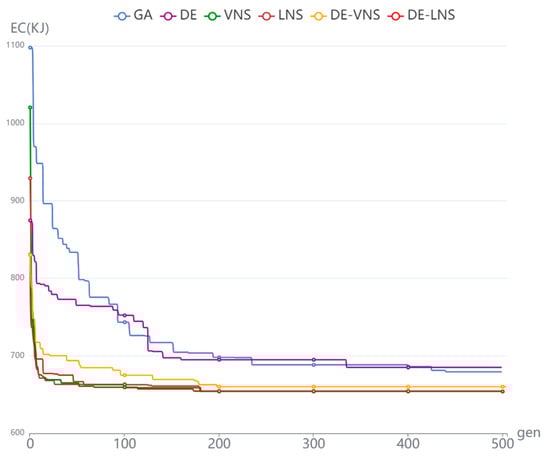 According to the experimental data, the calculation result of the DE-LNS algorithm is the best. The energy consumption of the transportation process obtained by the DE-LNS algorithm in the actual AGV logistics transportation task is 3.8% lower than that of GA and 2.1% lower than that of the DE algorithm. The standby energy consumption is optimized by 2.6% compared with GA and 36.2% compared with the DE algorithm. Although the results of the DE-LNS algorithm are larger than those of the VNS algorithm, LNS algorithm, and DE-VNS algorithm in terms of standby energy consumption, there are more optimizations in total energy consumption and transportation energy consumption. The total energy consumption calculated by the DE-LNS algorithm is 0.06% lower than that of VNS, 0.08% lower than that of LNS, and 9.34% lower than that of DE-VNS. Note that the VNS algorithm calculates more AGVs.