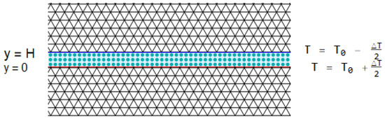 As shown in the planar diagram in Figure 1, the analysis is restricted to 2D rolls, which means that the dynamics in any plane parallel to the plane will be identical; in other words, the physical quantities do not depend on the spatial variable z. The components of the velocity vector in this 2D setup are taken to be , respectively, in the x and y directions. It is further assumed that the solid and liquid phases of the considered problem are in local thermal equilibrium and that the porous media possess homogeneous properties in both directions. In addition, the dissipation due to viscosity is assumed to be negligibly small. Under such assumptions, one can invoke Oberbeck–Boussinesq approximation to write the governing equations in the following form: