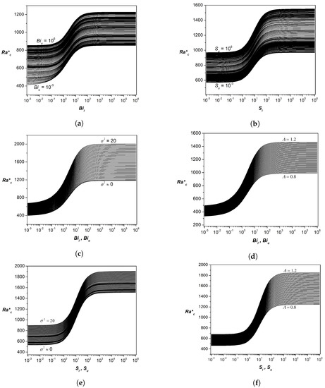 The non-dimensional numbers appearing in Equations (7)–(11) are as follows: is the modified Prandtl number, is the Prandtl number, is the thermal diffusivity ratio, is the porosity, is the viscosity ratio, is the inverse Darcy number or the porous parameter, is the Rayleigh number, is the modified Rayleigh number, are the slip Darcy numbers at lower and upper plates, respectively, and are the Biot numbers at lower and upper plates, respectively.