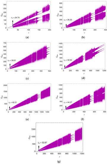 The bifurcation diagrams in Figure 4 are plots made through considering the time series of and extracting local maximum values from it. To find the time series of , numerical integration of the Lorenz system (67)–(69) using the standard fourth-order Runge–Kutta method, with a step-size of , was performed, and the local maximum of ) in the time interval (0, 1000) was extracted. The bifurcation diagram depicts the transition to chaos at the Hopf bifurcation point, , and the chaotic motion seen beyond in the plane was interrupted by periodic motions of various periodicities. The intensity of chaos in each period was determined using vigorous oscillations or otherwise, as seen in the diagram. The more vigorous the oscillations the more chaotic the system. A period of periodic motion serves the purpose of conserving energy (fueling zone), which is later used in the next spell of chaos for its sustenance in a range of values of r. From the bifurcation diagrams with respect to the various boundary combinations shown in Figure 4, it is clear that they look alike in content, except for the fact that they are translated versions of each other. In the case when one of the boundaries is adiabatic, the chaos is more intense compared to that in the case when both boundaries are isothermal. This is obviously due to the lack of exchange of thermal energy through such a boundary between the system and its surrounding. Now, coming to the aspects pertaining to the velocity boundary condition, it was found that, in the case of a rigid boundary combination, the appearance of chaos or periodic motion took place at large values of r, almost three times that in the case of the free boundary combination. We even noticed this result in the case of linear theory, due to the liquid sticking to the rigid boundary.