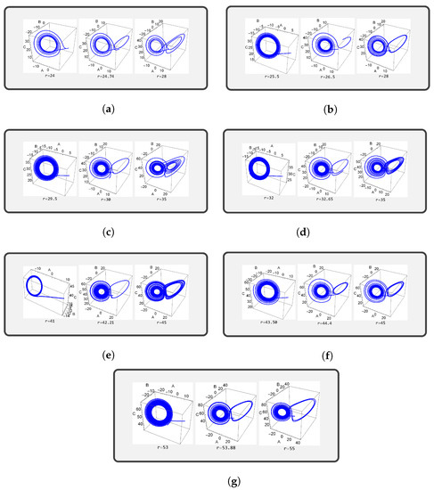 Figure 5 shows phase-space plots of the seven chosen boundary combinations. Three ranges of values of r are considered in each plot: , , and . The phase-space plot pertaining to is typically that of regular convective motion. Looking at the plot for , we obtain a picture of the trajectories moving away from one of the post-onset critical points and proceeding towards the other post-onset critical point. A very important point to note regarding these trajectories is that the nonlinear terms, and , in the generalized Lorenz model are responsible for keeping the trajectories within the ellipsoidal trapping region. In other words, this means the solution to the generalized Lorenz model always remains bounded. Applying the Lipschitz condition to the initial value problem involving the generalized Lorenz model, it can be seen that the various loop-like structures (butterfly diagram) are non-intersecting. This is a case of chaotic dynamics. In the case when periodic motion appears beyond , the trajectories traced the same loop(s). The number of loops, say n, seen in the phase space plots indicates that the periodic motion is of period n.